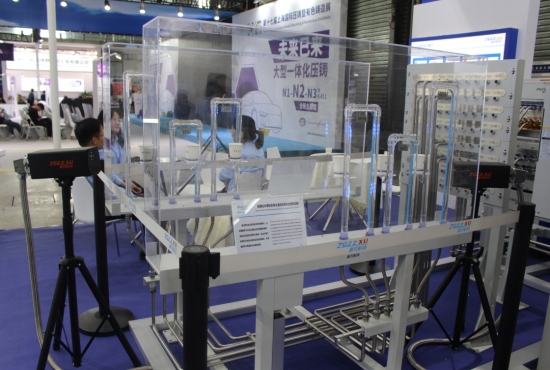 新昱智能參展團(tuán)隊,左五為公司總經(jīng)理王蘇華先生、左四為銷售總監(jiān)劉傳臺先生 新昱科技銷售總監(jiān)劉傳臺先生表示:“針對新能源汽車和“大型一體化壓鑄”對超大溫控組單元及數(shù)量眾多的水溫機(jī)的要求,新昱科技加大研發(fā)投入,歷時三年成功開發(fā)出CTM大型高溫水路控制系統(tǒng)(簡稱:CTM)。單臺CTM大型高溫水路控制系統(tǒng),可替代溫控組單元中的十多臺水溫機(jī),使得超大型壓鑄島溫控組單元更加節(jié)省占地空間、節(jié)省成本、節(jié)能降耗以及精準(zhǔn)溫控。”