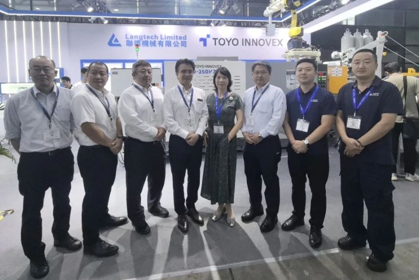 聯(lián)德機(jī)械、日本東洋TOYO管理層合影 TOYO INNOVEX株式會(huì)社 中國(guó)營(yíng)業(yè)部部長(zhǎng)代理 間鍋 宏樹(左1)、中國(guó)營(yíng)業(yè)部部長(zhǎng)代理 岡本 卓磨(左2)、執(zhí)行役員兼中國(guó)營(yíng)業(yè)部部長(zhǎng) 牧 卓矢(左4)、董事兼本部營(yíng)業(yè)部部長(zhǎng) 山本 博之(右3),東曜機(jī)械貿(mào)易(上海)有限公司副總經(jīng)理 松下 直哉(左3) ,與聯(lián)德機(jī)械集團(tuán)聯(lián)朗(上海)機(jī)械有限公司總經(jīng)理駱妍嵐女士 (右4)、銷售總監(jiān)郭濤(右2)、技術(shù)經(jīng)理張慶泳(右1)