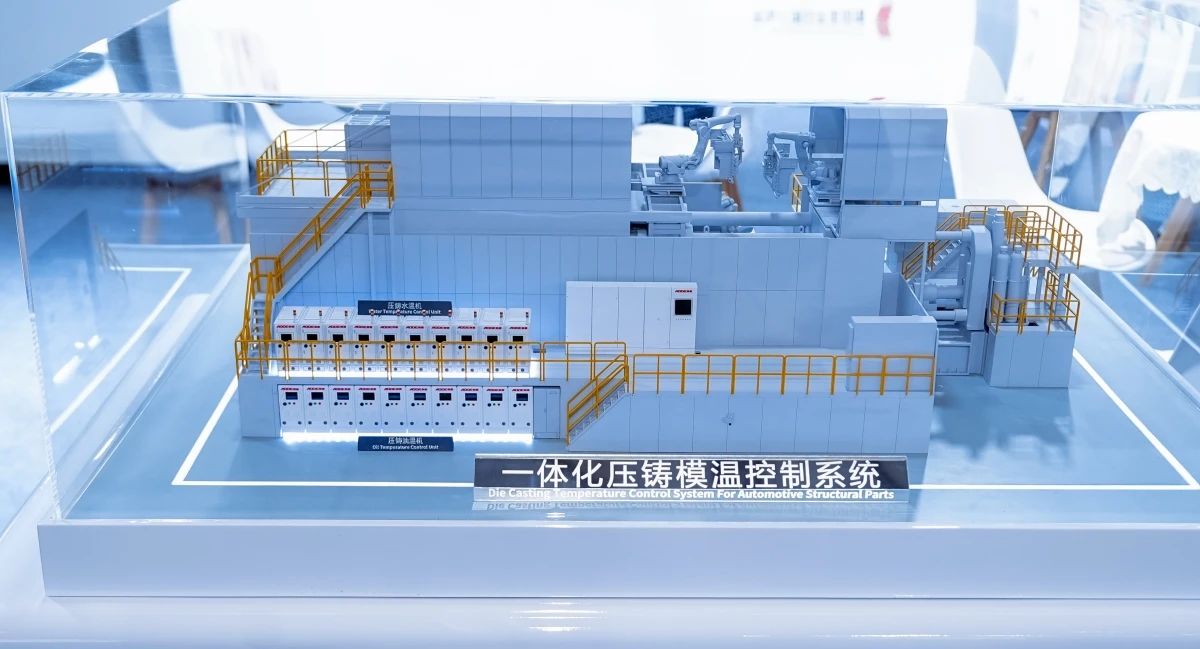 一體化壓鑄溫控控制系統 展會現場展示的一體化壓鑄溫控控制系統大模型,通過180℃壓鑄專用水溫機、320℃壓鑄專用油溫機、高壓點冷機等多系列溫控設備的集中控制與協同,成功攻克了從6000噸直至全球最大16000噸級巨型壓鑄模具的溫度均勻性平衡與毫厘級精準控制這一行業痛點,有力推動了大型結構件一體化壓鑄的發展進程。 值得一提的是,此次展會中,奧德高端裝備緊扣鎂合金半固態成型工藝熱點,著重展示了該成型工藝下的模溫控制技術方案。由于鎂金屬活性高的特性,鎂合金易燃易爆,因此在成型過程中溫度控制格外嚴苛,以保障持續、穩定的模具溫度,實現高安全性、高成品率的半固態注射成型生產。 據介紹,奧德高端裝備在鎂合金半固態溫控設備領域已有多年的技術積累和成熟的工藝方案,已為諸如寶武鎂業等鎂合金龍頭企業提供模溫控制設備。針對這方面的溫控設備,奧德高端裝備可以為用戶提供涵蓋鎂合金專用模溫機、油冷式的點冷機、低溫油冷式的冷卻站(模冷系統)等的全套溫控單元。