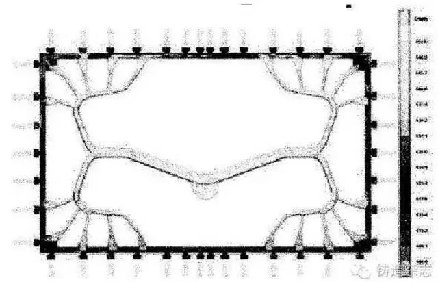 圖1 高壓壓鑄件框架 “這個(gè)鑄件充型時(shí)金屬液需要流動幾米長的距離,能完全充滿嗎?”項(xiàng)目經(jīng)理AxelSchmidt問道。“完全充滿需要多少時(shí)間?如果金屬液流動前端流動了2~3 m后相遇,會發(fā)生什么情況?流動長度的變化會有多大?大量的內(nèi)澆口施加在框架上的拉力有多大?我們必須在開始工作的早期就以一種成本效益好的方式回答這些問題。” DGS選擇A360鋁合金作為框架鑄件的材料,因?yàn)檫@種合金強(qiáng)度高,韌性好。項(xiàng)目工程師決定這個(gè)薄壁框架零件具有“Z”字形的橫截面。但是對于這種大型薄壁設(shè)計(jì)這種形狀的零件有很大困難。 最初,DGS項(xiàng)目團(tuán)隊(duì)設(shè)計(jì)了一個(gè)有兩條主線的澆注系統(tǒng)。隨后工程師采用模擬軟件評估了這個(gè)設(shè)計(jì)的關(guān)鍵問題,如流動長度、充型溫度,以及通過虛擬實(shí)驗(yàn)手段評估物質(zhì)痕跡,并進(jìn)行優(yōu)化。最初的模擬結(jié)果顯示這個(gè)設(shè)計(jì)主要的問題是變形。框架面的變型量達(dá)到9 mm,遠(yuǎn)遠(yuǎn)超過了客戶的規(guī)定變形量。DGS的工程師決定完全重新設(shè)計(jì)澆注系統(tǒng),并且檢查修改設(shè)計(jì)的效果。最終設(shè)計(jì)的澆注系統(tǒng)有20個(gè)內(nèi)澆口,主要分布在4個(gè)角部區(qū)域,成功地防止了嚴(yán)重的變形(圖2)。