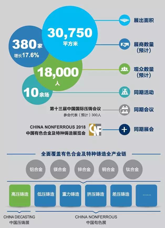 CHINA DIECASTING中國壓鑄展與CHNNA NONFERROUS中國有色展將于2018年7月18-20日在上海新國際博覽中心再度拉開帷幕,規模將進一步擴充至30,750平米,聚焦有色鑄造全產業鏈,平臺將從專業、服務、體驗等多角度再度得到全面提升! 平臺升級,價值傳遞