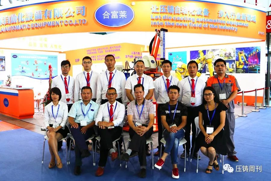 合富萊參展團隊,前排右三為楊炳榮先生 東莞合富萊此次展示多款技術(shù)先進的壓鑄自動化周邊設(shè)備,包括五連桿式高速給湯機(HFLLD-2#)、連桿式單伺服沃鈴噴霧機(HFLRADMW-2#)、連桿式伺服取出機(HFLEADM-2#)、熱室伺服噴取一體機(HFLREDMW-2#),以及噴霧、取件機器人壓鑄島(HFLYZD)系列,滿足不同客戶的需求。
