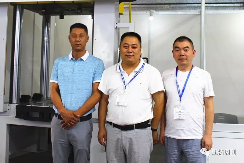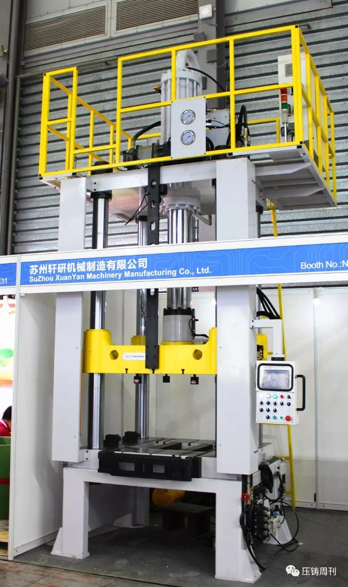 蘇州軒研參展團隊部分成員,中為總經(jīng)理王鋒先生 在2018中國壓鑄展上,蘇州軒研展示了一臺帶接料盤的伺服節(jié)能切邊機,這是一臺合模力為60T的較大噸位機型。該切邊機配置了接料盤,無需取件環(huán)節(jié),周期更短,效率更高;設(shè)備整體結(jié)構(gòu)(模板)加厚設(shè)計,機器運行更加強壯有力、耐用。與此同時,該機型還采用了伺服節(jié)能系統(tǒng),在節(jié)能效果大幅提升,最高可節(jié)能65%以上。
