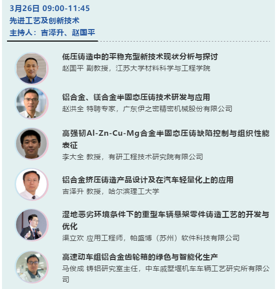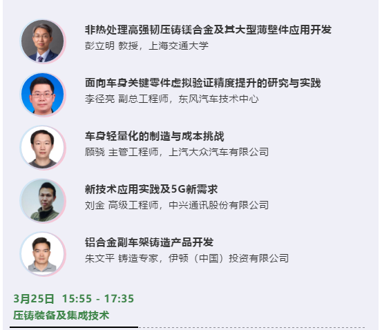 ![]() 近年來,隨著全球經(jīng)濟的發(fā)展,汽車、機電、通訊、家電、醫(yī)療等應(yīng)用領(lǐng)域?qū)鸿T件的需求穩(wěn)步增長。與此同時,輕量化、新能源、5G、新基建、高端消費市場的崛起,對壓鑄產(chǎn)品提出了更高的要求。在此背景下,中國機械工程學(xué)會鑄造分會承辦的全國壓鑄年會將于3月24-26日在深圳維納斯皇家酒店舉辦,近30場技術(shù)報告、企業(yè)創(chuàng)新成果展示、對話行業(yè)專家、參觀鑄造企業(yè)、璀璨華南之夜......誠邀壓鑄同行蒞臨參會! 壓鑄會議專家組織委員