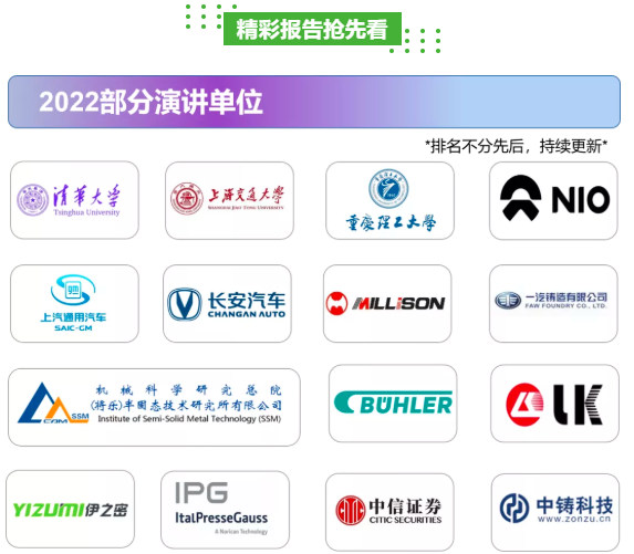 合金材料開發(fā)及應用 ◆ 汽車結(jié)構(gòu)件非熱處理壓鑄鋁合金開發(fā)及其在減震塔上的應用驗證 熊守美,教授,清華大學;副理事長,中國機械工程學會鑄造分會 ◆ 基于機器學習的高壓鑄造鋁-鎂-硅合金的微觀組織識別與力學性能預測 汪星辰,博士后,上海交通大學 ◆ 非熱處理高強高韌壓鑄鋁合金材料在汽車工業(yè)中的應用 袁靈洋,博士后,上海交大輕合金中心 產(chǎn)品開發(fā)及集成計算材料工程 ◆ 超大集成壓鑄產(chǎn)品關(guān)鍵技術(shù)及發(fā)展趨勢 鄧為工,董事長/黨委書記,一汽鑄造有限公司;副理事長,中國機械工程學會鑄造分會 ◆ 高強韌鋁合金真空壓鑄一體化設計及應用 周志明,副院長,重慶理工大學材料科學與工程學院 先進工藝及創(chuàng)新技術(shù) ◆ 一體式零件鑄造工藝技術(shù)研究探索 林兆富,汽車制造中心鑄造工藝設計所經(jīng)理,重慶長安汽車股份有限公司 ◆半固態(tài)技術(shù)在高導熱大型薄壁壓鑄件上的應用 占亮,總經(jīng)理,機械科學研究總院(將樂)半固態(tài)技術(shù)研究所有限公司 ◆ 新能源汽車結(jié)構(gòu)件高壓壓鑄工藝的智能應用實踐分享 楊衛(wèi)學,壓鑄工藝技術(shù)經(jīng)理,意特佩雷斯壓鑄設備(上海)有限公司 壓鑄裝備及集成技術(shù) ◆ 大型壓鑄單元在新能源汽車中的應用 力勁集團 ◆ 超大型兩模板壓鑄島的規(guī)劃與布局 盧宏遠,技術(shù)及銷售總顧問,布勒(中國)機械制造有限公司 ◆智能化超大型一體化壓鑄的最新進展和未來發(fā)展趨勢 王博,產(chǎn)品與市場管理部經(jīng)理,廣東伊之密精密機械股份有限公司 壓鑄行業(yè)政策、趨勢、市場 ◆ 鑄造供應鏈可持續(xù)發(fā)展倡議 朱昱,技術(shù)經(jīng)理,上汽通用汽車有限公司 ◆ 壓鑄行業(yè)大數(shù)據(jù)發(fā)布 劉志國,運營總監(jiān),寧波中鑄信息科技有限公司 ◆一體壓鑄趨勢下壓鑄行業(yè)發(fā)展的機遇與挑戰(zhàn) 李越,機械行業(yè)聯(lián)席首席分析師,中信證券股份有限公司 ◆ 論企業(yè)的可持續(xù)發(fā)展與未來愿景的鑄就 Gary Hughes,NPI主管,蔚來汽車 目前已確認的部分報告,該排序非報告順序。 精彩報告持續(xù)更新中,敬請期待…… 配套多元同期活動,助力行業(yè)發(fā)展