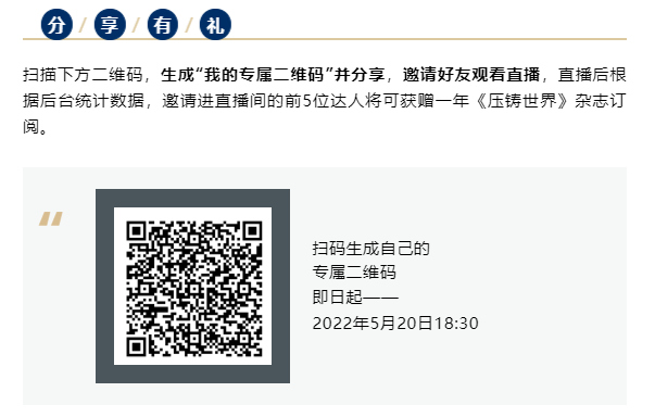 汽車鑄造俱樂部—大型一體化壓鑄 “一體壓鑄成型工藝”因其在輕量化、環保、成本方面的優勢脫穎而出,壓鑄行業又一次迎來了技術的顛覆,邁入“大壓鑄時代”,隨之而來的是裝備全面的革新。未來,隨著一體壓鑄應用范圍的不斷擴大,壓鑄工藝將有望取代傳統沖壓+焊裝工藝;同時,壓鑄在5G、醫療、建筑模板、智能化等新興應用領域不斷深入拓展,壓鑄市場未來可期。 值此背景下,由中國機械工程學會鑄造分會組織成立的“汽車鑄造俱樂部”啟動“對話大型一體化壓鑄”線上研討系列專題活動,邀請來自整車廠、解決方案提供商、跨界領域專家,從高端模具制造、先進材料研發、產品設計開發等方向,共同探討新能源汽車、輕量化及有色鑄造行業的發展路徑。 第二期直播帶來“對話大型一體化壓鑄—合金材料研發及應用專場”,將邀請智己汽車、美國鋁業、上海交大、帥翼馳等知名企業及單位,從多角度探討大型一體化壓鑄對合金材料的要求,免熱處理壓鑄材料的技術難點,材料品質管控流程,國內和國外使用的材料是否相同... ... ,5月20日(周五)晚19:00-21:00,您關注的大型一體化壓鑄材料相關問題,這里都有,歡迎前來直播間互動交流!