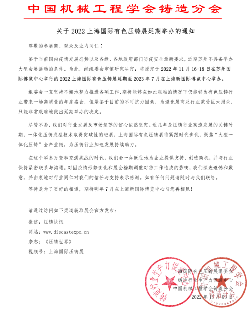 ![]() 尊敬的參展商、觀眾及業內同仁∶ 鑒于當前國內疫情發展態勢以及各級、各地政府部門防疫安全最新要求,近期蘇州不具備舉辦大型會展活動的條件。為此,經組委會審慎研究決定:將原定于2022年11月16-18日在蘇州國際博覽中心舉行的2022上海國際有色壓鑄展延期至2023年7月在上海新國際博覽中心舉辦。 組委會一直堅持不懈地努力推進各項工作,期待能夠在如此艱難的情況下仍能夠為有色壓鑄行業帶來一場高質量的年度盛會,但是鑒于目前的不可抗力因素,為避免展商及行業蒙受巨大損失,只能非常艱難地做出延期舉辦的決定。 盡管不易,我們對行業發展及市場復蘇的信心依然堅定。近幾年是壓鑄行業高速發展的關鍵時期,一體化壓鑄成型技術取得突破性的進展,上海國際有色壓鑄展將緊跟時代步伐,聚焦“大型一體化壓鑄”全產業鏈,為壓鑄行業加速發展持續助力。 在這個瞬息萬變和充滿挑戰的時代,我們會一如既往地為企業提供支持、創造商機,并與行業保持緊密聯系與溝通。對因疫情形勢變化和展會檔期調整對您工作造成的影響,我們深表遺憾和歉意,并由衷地對行業同仁對我們的信任與支持表示感謝。如有任何問題請隨時與我們聯絡。 等待是為了更好的相遇,期待明年7月在上海新國際博覽中心與您再相見!