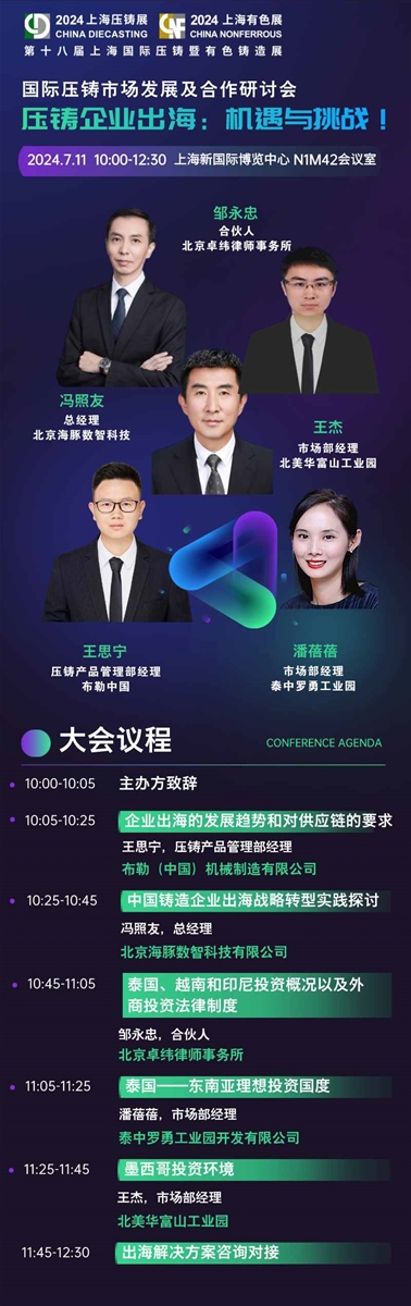 2024上海國際有色壓鑄展(CID&CNF)將舉辦“壓鑄企業(yè)出海:機遇與挑戰(zhàn)!”專題研討會,聚焦于海外市場發(fā)展趨勢,分享不同國家和地區(qū)的市場特點與規(guī)劃策略,探討企業(yè)如何在國際舞臺上立足,引領(lǐng)行業(yè)創(chuàng)新發(fā)展。與會專家學(xué)者將分享獨到見解和成功經(jīng)驗,為壓鑄企業(yè)的全球化戰(zhàn)略提供有力支持。 主題:壓鑄企業(yè)出海:機遇與挑戰(zhàn) 時間:7月11日 10:00 - 12:30 地點:上海新國際博覽中心 N2M42會議室