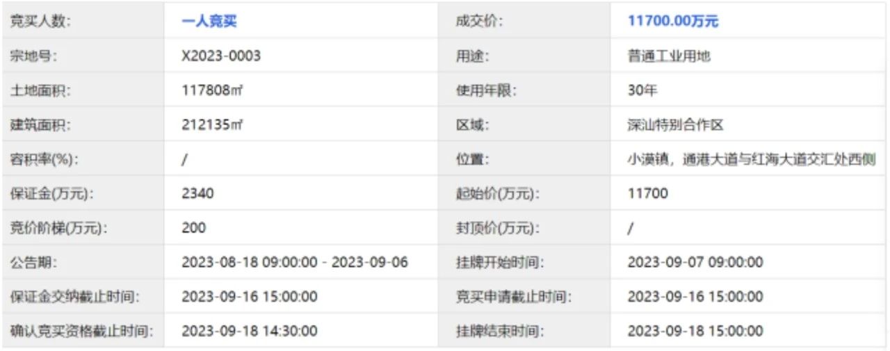來自深圳市公共資源交易中心消息,9月18日,比亞迪以底價1.17億元新競得深圳市深汕特別合作區(qū)一宗工業(yè)用地,土地面積117808平方米,建筑面積212135平方米,土地用途為普通工業(yè)用地,準(zhǔn)入行業(yè)類別為新能源行業(yè)。根據(jù)規(guī)劃,該宗地將用于建設(shè)深汕比亞迪汽車工業(yè)園二期項目。