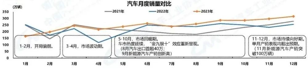 數據顯示,2023年12月,汽車產銷分別完成307.9萬輛和315.6萬輛,產量環比下降0.5%,銷量環比增長6.3%,同比分別增長29.2%和23.5%。其中,乘用車產銷分別完成271.3萬輛和279.2萬輛,環比分別增長0.3%和7.2%,同比分別增長27.7%和23.3%;商用車產銷分別完成36.6萬輛和36.4萬輛,環比分別下降5.7%和0.4%,同比分別增長41.7%和25.1%。新能源汽車產銷分別完成117.2萬輛和119.1萬輛,同比分別增長47.5%和46.4%,市場占有率達到37.7%。 2023年1-12月,汽車產銷累計分別完成3016.1萬輛和3009.4萬輛,同比分別增長11.6%和12%。其中,乘用車產銷分別完成2612.4萬輛和2606.3萬輛,同比分別增長9.6%和10.6%;商用車產銷分別完成403.7萬輛和403.1萬輛,同比分別增長26.8%和22.1%;新能源汽車產銷分別完成958.7萬輛和949.5萬輛,同比分別增長35.8%和37.9%,市場占有率達到31.6%。