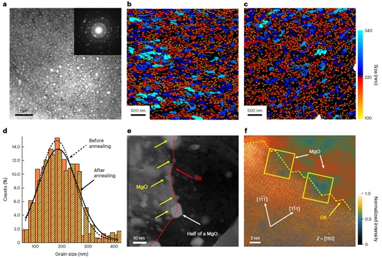 據(jù)介紹,氧化物彌散強(qiáng)化(ODS)合金是用于極端環(huán)境(例如高溫和耐輻射應(yīng)用)的前沿高強(qiáng)度材料。到目前為止,科學(xué)家已經(jīng)通過化學(xué)加工方法開發(fā)了可還原金屬的 ODS 合金,但由于氧化物顆粒均勻分散的挑戰(zhàn),還沒有商用的不可還原金屬(即 Al 鋁、Mg 鎂、Ti 鈦、Zr 鋯等)的 ODS 合金。 何春年團(tuán)隊(duì)提出了一種通過粉末冶金獲得含有高度分散的 5nm MgO 納米顆粒的 ODS 鋁合金的策略,使用具有原位生長的類石墨烯涂層的納米顆粒。值得注意的是,密集分散的 MgO 納米顆粒與 Al 鋁基體具有完全共格關(guān)系,可有效抑制界面空位擴(kuò)散,從而在高達(dá) 500°C 的溫度下實(shí)現(xiàn)前所未有的抗拉強(qiáng)度(200MPa)和抗蠕變性。 |
