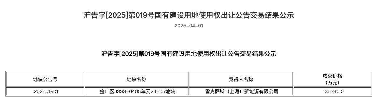 比亞迪以3.75億元競(jìng)得西安1210畝建設(shè)用地 從西安市公共資源交易中心獲悉,西咸新區(qū)比亞迪實(shí)業(yè)有限公司于3月28日以3.75億元的價(jià)格,競(jìng)得一處西咸新區(qū)秦漢新城國(guó)有建設(shè)用地使用權(quán)。該地塊面積為806975.86平方米(約1210.46畝),包含原寶能汽車用地。該公司今年1月就曾以3.9719億元競(jìng)得相鄰的一處面積約88.3萬(wàn)平方米(約1323.96畝)的建設(shè)用地使用權(quán)。 雷克薩斯以13.53億元在滬購(gòu)得112.7萬(wàn)平米項(xiàng)目用地 4月1日,上海土地市場(chǎng)官網(wǎng)公示,豐田汽車在上海設(shè)立的雷克薩斯(上海)新能源有限公司以底價(jià)13.534億元拿下上海金山區(qū)工業(yè)用地,占地面積1127837㎡,總建筑面積225萬(wàn)㎡。該用地準(zhǔn)入行業(yè)類型包括新能源汽車整車制造、鋰離子電池制造、其他電池制造。