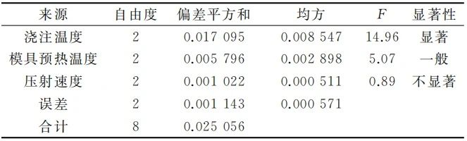 表6 方差分析表 在僅考慮縮孔率的情況下,可知,A>B>C,即壓鑄工藝參數對縮孔率的影響程度由大到小依次為:澆注溫度、模具預熱溫度、壓射速度。在僅考慮縮孔率的情況下,滿足信噪S/N2最大的壓鑄工藝參數組合為A1B2C1,即澆注溫度為660℃、模具預熱溫度為180 ℃、壓射速度為4.5m/s。