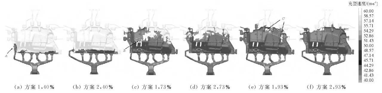 圖3 2種方案充型速度模擬結果 可以看出,方案1的溫度分布很不均勻,靠近鑄件中間區域有很大面積的溫度較低,不超過630℃,而其他區域的溫度都達到645℃以上,形成了較大的溫度差,使得該區域在凝固過程中的速度不一致,有明顯的凝固時間差,導致后凝固的區域得不到金屬液補縮。易出現嚴重的縮孔缺陷。方案2的溫度分布較為均勻,鑄件的主體位置溫差不超過3℃。就填充溫度來看,方案2優于方案1。當填充至40%時,方案1中A位置的填充速度過快,達到50m/s以上,使得速度較快的金屬液會優先填充鑄件,導致鑄件填充不均勻。當填充至73%時,因為A區域的金屬液填充過快,使得在與速度較慢的金屬液混合時會形成未填充的空白區域,見圖3c中B區域。該區域由于被兩股金屬液包圍而后才慢慢被填充,導致該區域容易出現憋氣現象。當填充至90%時,出現了大片容易憋氣的區域,見圖3e中C區域。相較于方案1,方案2的充型速度模擬效果更好。