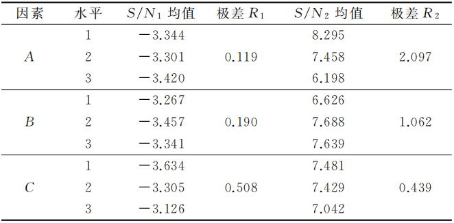 表4 信噪比計算結果 在僅考慮卷氣率的情況下,從表5可知,C>B>A,即壓鑄工藝參數對卷氣率的影響程度由大到小依次為:壓射速度、模具預熱溫度、澆注溫度。可以得到,在僅考慮卷氣率情況下,滿足信噪比S/N1最大的壓鑄工藝參數組合為A2B1C3,即澆注溫度為680℃、模具預熱溫度為160℃、壓射速度為6.5m/s。