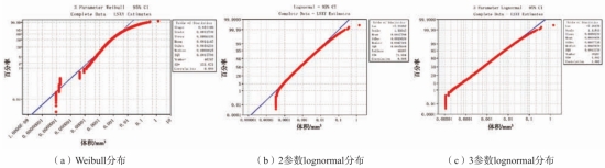式中:λ是尺度參數,m是形狀參數,x是變量(此處為每個孔洞的體積),x0是位置參數(最小氣孔體積)。2參數Lognormal分布和3參數Lognormal分布的概率密度函數如下: