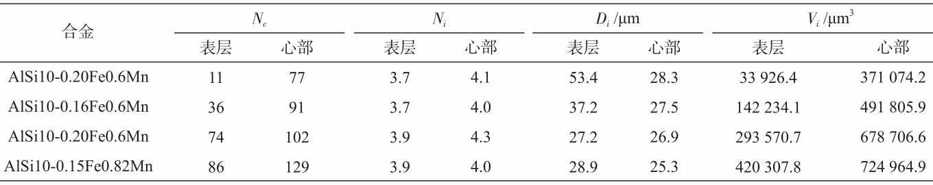 圖8 壓鑄AlSi10MgMn alloys 合金等效直徑超過10 μm的富Fe金屬間化合物 基于富Fe金屬間化合物的等效直徑對具有不同錳和Fe含量的合金表層及心部金屬間化合物進行了定量分析,如圖9所示。此外,還提取了不同等效直徑金屬間化合物的三維形貌。由圖可知,對于所有合金而言,心部的金屬間化合物數量遠多于表層。各合金中的金屬間化物特征如下。