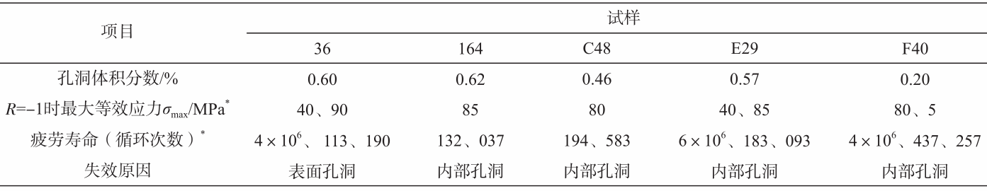 圖16 不同加載條件下壓鑄AlSi10MgMn合金中孔洞的變化 鋁合金鑄件在交通運輸領域的應用日益增多,鑒于其在服役過程中所承受的載荷呈現出循環特性,疲勞性能已然成為鋁合金鑄件設計環節中極為關鍵的考量因素。Li和Lee結合X射線斷層掃描技術和有限元分析(FEA),對重力鑄造A356-T6合金中疲勞裂紋擴展與孔洞之間的相互作用展開了研究。結果表明,處于疲勞裂紋尖端附近的孔洞會和裂紋發生相互作用,進一步提高裂紋擴展速率。此外,研究者還分析了孔洞對重力鑄造和消失模鑄造A319合金疲勞性能的影響,為深入理解合金微觀組織與疲勞性能之間的內在聯系提供了重要參考依據。 在傳統壓鑄鋁合金中,微觀孔洞必然會對合金的疲勞性能產生重要影響。Vanderesse等人對5個壓鑄AlSi9Cu3合金試樣進行了疲勞試驗,結果如表4所示。此外,對孔洞的三維特征分析以及利用有限元分析(FEA)計算孔洞周圍的應力集中已應用于壓鑄鋁合金的研究中。結合X射線斷層掃描結果發現,試樣的疲勞裂紋起源于表面孔洞和內部孔洞。