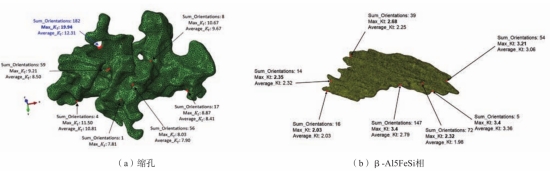 圖21 基于連續切片掃描電子顯微鏡(SBFSEM)高真空壓鑄鋁合金微觀組織三維特征 4.2 微觀結構特征與性能之間的關系 根據X射線斷層掃描獲得的材料內部各相的實際三維特征,結合多物理場計算模擬,可以分析特征和分布對材料力學性能的影響。例如:含孔洞的產氚陶瓷球中的熱傳遞問題;考慮顆粒實際特征的發光復合材料以及B4Cp/6061Al復合材料的應力與損傷分析;凝固過程中富Fe金屬間化合物的形成對鋁合金滲透性的影響;實際幾何形狀預制體中的滲流情況等。在傳統壓鑄件中,孔洞是影響鑄件力學性能的主要因素。通過將X射線斷層掃描得到的三維特征導入有限元模型,可以研究壓鑄鋁合金疲勞試驗中孔洞周圍的應力集中以及孔洞對裂紋擴展的影響。作者進一步對含微觀孔洞的壓鑄AlSi10MgMn合金斷裂過程展開模擬,并通過原位拉伸試驗進行了對比和驗證。這些研究表明,微觀組織的多物理場模擬在探索微觀組織與性能之間的關系上展現出了廣闊的應用前景。對于壓鑄鋁/鎂合金而言,基體晶粒和金屬間化合物為影響力學性能的決定性因素。它們具有復雜的空間特征與分布狀態,存在嚴重的非均勻性,如圖21所示。雖然已有關于晶體彈性或塑性的研究報道,但這些研究常常把基體視為單一相。有研究者基于重力鑄造AlSiCu合金中縮孔和片狀β-Fe的實際形貌進行有限元分析,計算了其各部位應力集中因子,如圖22所示,是目前唯一一項基于實際微觀結構運用有限元分析鑄造鋁合金雙相或多相影響的研究。由此可見,使用多物理場有限元分析計算高真空壓鑄鋁/鎂合金中晶粒和金屬間化合物等多相對力學性能的影響仍存在困難和挑戰。這些挑戰包括:不同相的應力應變關系;相界面的結合強度;能包含全部組織特征的計算域尺度;以及適合不同尺寸相的自適應網格。但是,這些分析可以直接揭示微觀組織特征與性能之間的關系,具有很高的研究價值。