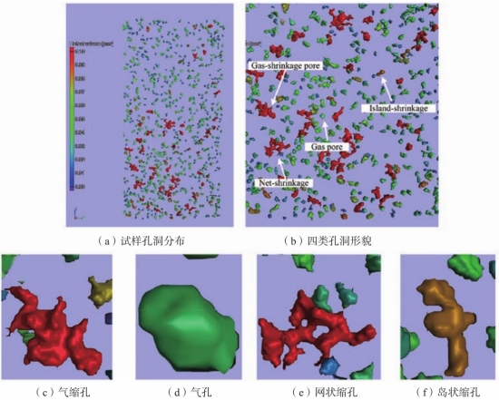 圖1 基于連續切片技術重構壓鑄AE44合金中的孔洞 在鑄造工藝的研究中,同步輻射X射線已被廣泛應用于觀察液態金屬充型階段的流動以及凝固過程枝晶和孔洞的形成。這些研究展示了X射線投影下的二維圖像。隨著X射線斷層掃描技術的發展,鋁合金鑄件中的相可以通過更高分辨率的無損檢測手段進行分析并獲得三維特征信息。由于微觀孔洞的存在會降低鋁合金鑄件性能,研究者利用先進的μ-CT技術對重力鑄造鋁合金中的微觀孔洞特征展開了研究。其優點在于檢測范圍大,分辨率高,并能定量分析孔洞空間特征。研究表明,通過X射線斷層掃描技術測得的重力鑄造鋁合金孔隙率可能比金相所得的孔隙率大好幾倍。 如前文所述,壓鑄鋁/鎂合金中的孔洞多樣且具有不同特征。作者通過1600T冷室壓鑄機生產ADC12壓鑄件,并從中提取了48個疲勞試樣。利用X射線斷層掃描技術重構了試樣標距部分的微觀孔洞。圖2展示了孔隙率在0.1%至1.0%之間試樣中的孔洞分布,共檢測到了46 207個孔洞。所有試樣的平均孔隙率為0.55%,氣孔平均體積為0.001 982 mm³,最小孔洞體積為0.000 033 mm³,最大孔洞體積為1.388 mm³。基于X射線斷層掃描的結果,對試樣中孔洞的體積、表面積和球形度等特征進行了計算。根據這些特征,將孔洞分為氣孔、氣縮孔和縮孔。圖3展示了各類孔洞的形貌,其特征列于表1中。三類孔洞形成機制如下。