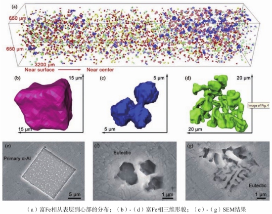 圖4 AM60壓鑄鎂合金孔洞三維形貌 1.2 富 Fe 金屬間化合物 在鑄造鋁合金中,Fe元素會與其他元素形成脆性的富Fe相,并在拉伸過程中成為裂紋起源,對鑄件的力學性能產生不利影響。高真空壓鑄鋁合金憑借其優勢,被廣泛應用于汽車結構件的生產。隨著對產品性能要求的日益攀升,迫切需要制造出具備高力學性能的鑄件。因此,對高真空壓鑄鋁合金中富Fe金屬間化合物的研究日益增多。富Fe金屬間化合物與鋁基體之間較大的密度差為X射線斷層掃描分析提供了便利。但在鋁/鎂合金壓鑄過程中,由于X射線無法穿透鋼模具,所以很難對合金的凝固過程進行實時觀察。因此,利用X射線斷層掃描技術分析研究壓鑄鋁/鎂合金中的富Fe金屬間化合物只能在鑄件成形后進行。 Xiong等人利用該技術研究了壓鑄亞共晶鋁-硅合金中富Fe相的形貌和形成機制,如圖5(a)所示。