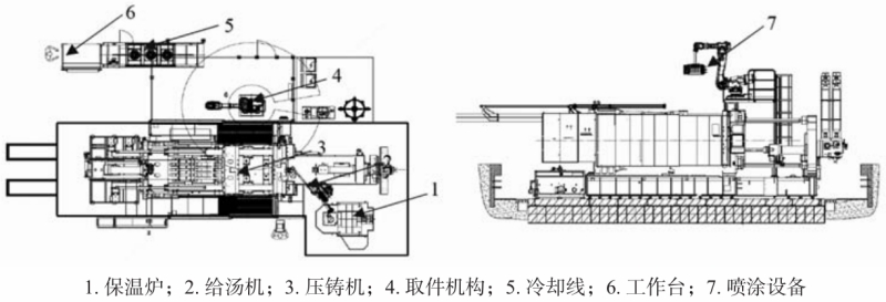 ![]() 原標(biāo)題:大型一體化壓鑄島周邊自動(dòng)化設(shè)計(jì)與實(shí)踐 摘要 隨著新能源汽車行業(yè)的快速發(fā)展,大型一體化車身壓鑄技術(shù)作為實(shí)現(xiàn)車身輕量化的關(guān)鍵技術(shù)之一,正逐漸受到業(yè)界的廣泛關(guān)注。本文旨在探討大型一體化壓鑄島周邊自動(dòng)化設(shè)計(jì)與實(shí)踐,通過(guò)分析傳統(tǒng)壓鑄現(xiàn)狀、大型一體壓鑄島布局、工藝流程和設(shè)備選型等方面,詳細(xì)闡述大型一體化壓鑄島周邊自動(dòng)化的關(guān)鍵技術(shù)要點(diǎn),為大型一體化壓鑄島周邊自動(dòng)化提供參考。 鋁合金壓鑄在汽車行業(yè)及通訊行業(yè)得到了廣泛的應(yīng)用,特別是2020年以來(lái),以特斯拉為首一體化壓鑄的興起,引領(lǐng)壓鑄行業(yè)進(jìn)入6 000 t以上超大型壓鑄時(shí)代。通常壓鑄機(jī)、保溫爐、噴涂系統(tǒng)、取件設(shè)備和冷卻設(shè)備等構(gòu)成了壓鑄單元,行業(yè)術(shù)語(yǔ)稱之為壓鑄島。這些設(shè)備協(xié)同工作,實(shí)現(xiàn)鋁合金等輕金屬快速成形,通過(guò)冷卻后得到所需的鑄件。一體化壓鑄興起以前,2 000 t壓鑄島周邊自動(dòng)化配備簡(jiǎn)單,如圖1傳統(tǒng)壓鑄島工藝布局,自動(dòng)化僅僅用于噴涂及取件,渣包和料餅去除全部采用手工去除。