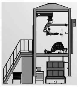 圖13 去毛刺站簡(jiǎn)圖 2.7 探傷檢測(cè)站 探傷主要檢測(cè)鑄件內(nèi)部的氣孔和縮孔等缺陷,一般以離線檢測(cè)為主,由于一體化壓鑄件產(chǎn)品尺寸大,采用離線檢測(cè)的方式耗時(shí),從壓鑄島搬運(yùn)到實(shí)驗(yàn)需要10 min,再將壓鑄件放入探傷設(shè)備檢驗(yàn)反饋結(jié)果,不僅搬運(yùn)勞動(dòng)強(qiáng)度大,耗時(shí)多,還結(jié)果反饋慢。在開(kāi)發(fā)初期就將探傷機(jī)放在壓鑄島內(nèi),可以實(shí)現(xiàn)快速探傷檢測(cè)。 同時(shí)由于信息傳遞延遲,浪費(fèi)時(shí)間。為了解決這些問(wèn)題,將X-RAY探傷設(shè)備集成在壓鑄島中,不僅減少了產(chǎn)品的搬運(yùn),還可以快速反映鑄件品質(zhì)的狀態(tài)。同時(shí)也可以根據(jù)增加抽檢的頻率。減少不良損失。圖14為X-RAY探傷設(shè)備的外形圖。產(chǎn)品放在檢測(cè)支架小車上,下方有四個(gè)滾輪,由于小車下面的軌道和探傷房?jī)?nèi)部的軌道不連續(xù),四個(gè)滾輪完美解決這個(gè)問(wèn)題。小車進(jìn)入鉛房?jī)?nèi),關(guān)閉安全門,開(kāi)始進(jìn)行探傷檢測(cè)。