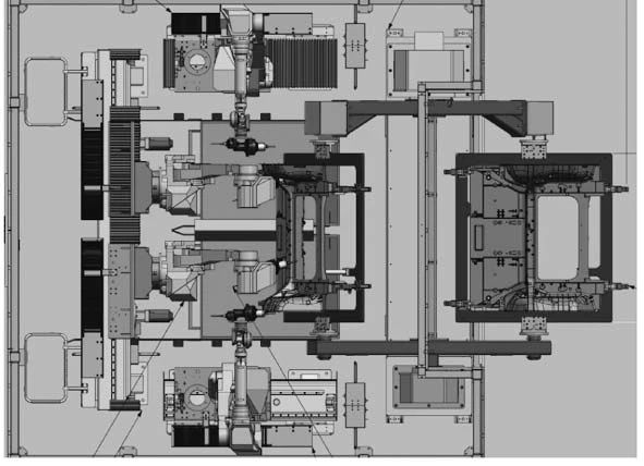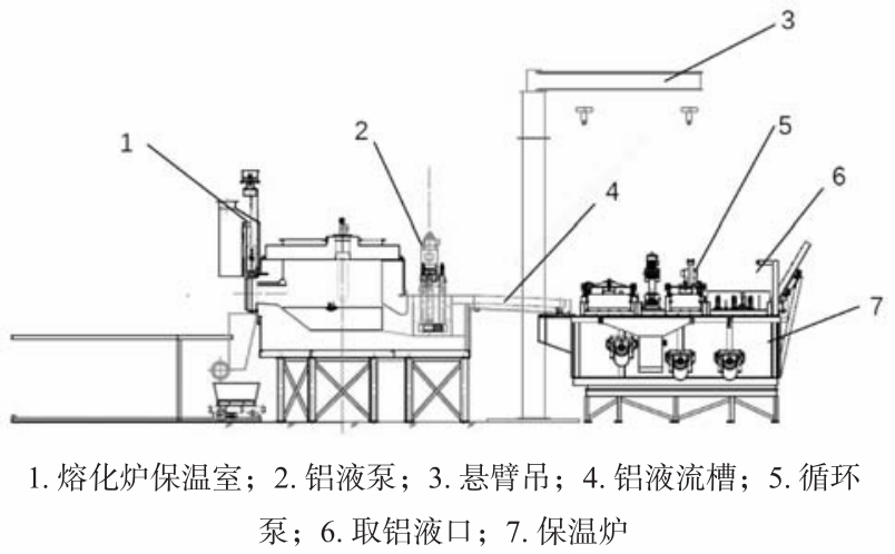 圖4 壓鑄島工藝布局。 2周邊關(guān)鍵設(shè)備設(shè)計(jì) 2.1 熔煉系統(tǒng) 大型一體化壓鑄帶澆注系統(tǒng)質(zhì)量約為82 kg,按90 s節(jié)拍計(jì)算,每小時(shí)鋁液消耗量為3.28 t,為了保證產(chǎn)能的穩(wěn)定性,選擇4 t/h熔化能力的熔化爐。為了保證保溫爐溫度的穩(wěn)定性,選擇10 t保溫爐。如圖5所示,鋁液熔化后,通過(guò)鋁液泵將鋁液運(yùn)輸?shù)奖貭t中,保溫爐下方也通過(guò)透氣磚通入氬氣,讓鋁液中的氫氣溢出,同時(shí)保溫爐也設(shè)計(jì)循環(huán)泵,保證鋁液的密度指數(shù)小于2%。同時(shí)也避免了傳統(tǒng)保溫爐通過(guò)叉車轉(zhuǎn)運(yùn)鋁液,大大降低了勞動(dòng)強(qiáng)度,提升了效率。