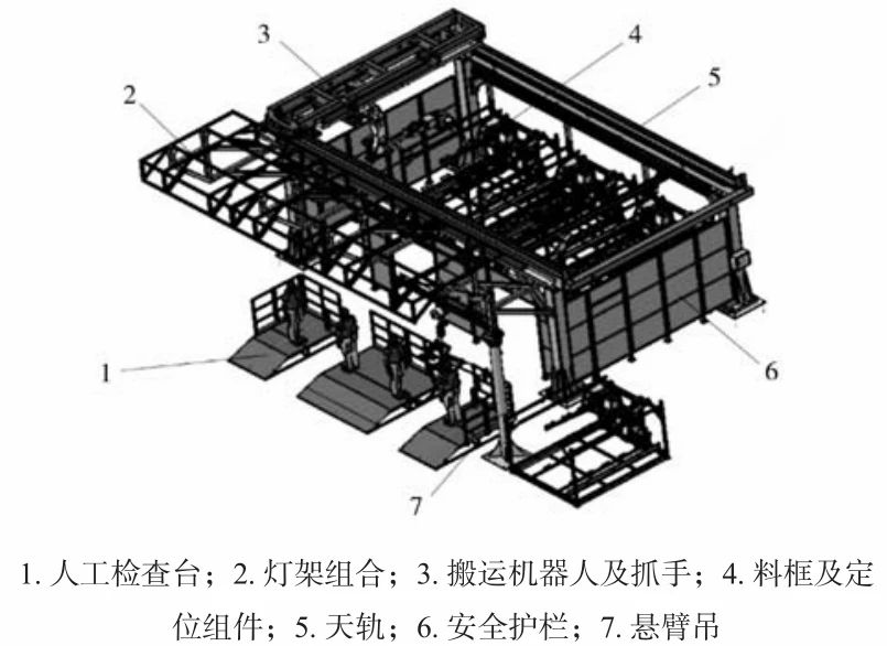 圖14 探傷設(shè)備外形圖 2.8 自動(dòng)化裝箱 圖15為產(chǎn)品在AGV上的示意圖。通過(guò)機(jī)器人將產(chǎn)品放在AGV小車上,小車識(shí)別到有產(chǎn)品后,搬運(yùn)產(chǎn)品到人工檢查工位(圖16);人工對(duì)產(chǎn)品外觀進(jìn)行100%檢查,檢查后輸入合格和不合格信息,信息傳遞到自動(dòng)化裝箱站。機(jī)器人根據(jù)產(chǎn)品信息將產(chǎn)品放入合格品或不合格品的料架,實(shí)現(xiàn)了自動(dòng)裝箱。當(dāng)裝箱站的料架裝滿產(chǎn)品后,自動(dòng)化裝箱站呼叫新的AGV進(jìn)入自動(dòng)化裝箱站,更換新的料架。整個(gè)過(guò)程自動(dòng)化完成,減少人工搬運(yùn),提高效率。