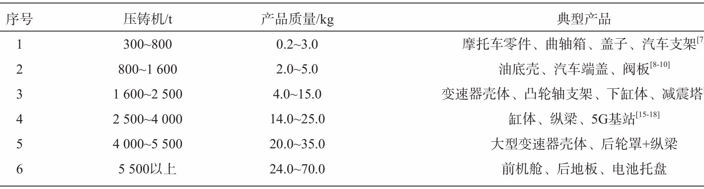 圖1 傳統(tǒng)壓鑄島工藝布局簡(jiǎn)圖 隨著免熱處理材料的開(kāi)發(fā),壓鑄零部件不斷向高集成化發(fā)展,零部件尺寸和質(zhì)量也在不斷增加,同時(shí)壓鑄機(jī)的噸位也隨之增加。通過(guò)調(diào)研,從表1壓鑄機(jī)與產(chǎn)品發(fā)展趨勢(shì)來(lái)看,壓鑄機(jī)的噸位越大,產(chǎn)品質(zhì)量越大。近年來(lái),大型一體化壓鑄零件在汽車領(lǐng)域的應(yīng)用越來(lái)越多,且集中在4 000 t以上,產(chǎn)品越來(lái)越大,質(zhì)量也隨之增加,人工搬運(yùn)產(chǎn)品變得效率低下,且勞動(dòng)強(qiáng)度越來(lái)越大,產(chǎn)品的渣包料餅去除,產(chǎn)品檢測(cè)過(guò)程中搬運(yùn)效率提升必須走自動(dòng)化路線。本文結(jié)合自身壓鑄島周邊設(shè)計(jì)與實(shí)踐經(jīng)驗(yàn),從產(chǎn)品工藝流程,壓鑄島周邊布局,熔化爐自動(dòng)化投料,噴涂工裝設(shè)計(jì)原理,快速水冷站設(shè)計(jì),渣包去除控制要點(diǎn)及工裝設(shè)計(jì),等離子去料餅方案,自動(dòng)化去毛刺,在線X-Ray探傷檢測(cè),自動(dòng)化裝箱和HSE等方面做了逐一說(shuō)明。