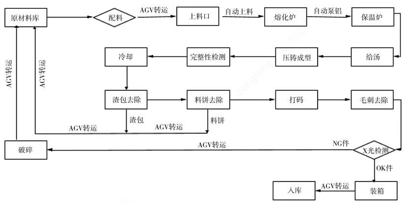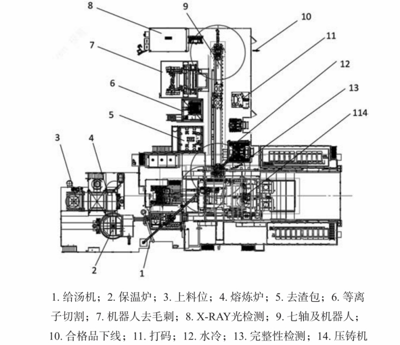 圖3 壓鑄工藝流程 1.2 壓鑄島周邊自動(dòng)化布局 根據(jù)圖3的工藝流程,把所有的加工都盡可能放在壓鑄島內(nèi)。如圖4壓鑄島工藝布局所示,物料的流動(dòng)如下:鋁液熔化后,通過(guò)鋁液泵將熔化爐中鋁液搬運(yùn)到保溫爐中;保溫爐中的鋁液通過(guò)給湯機(jī)搬運(yùn)到壓室,通過(guò)壓鑄機(jī)壓射,鋁液充填到模具成為帶澆注系統(tǒng)的產(chǎn)品;當(dāng)凝固冷卻后,取件機(jī)器人取件,放入冷卻工位冷卻;冷卻后,搬運(yùn)機(jī)器人將產(chǎn)品放入去渣包工位,去除渣包;機(jī)器人取件放入去料餅工位(等離子切割),去除料餅后,搬運(yùn)機(jī)器人將產(chǎn)品放入打碼工位,給產(chǎn)品刻印明碼及二維碼;隨后搬運(yùn)產(chǎn)品進(jìn)入去毛刺工位,去毛刺完成后,根據(jù)品質(zhì)檢測(cè)需要進(jìn)入X-RAY抽檢,完成后通過(guò)成品下線AGV運(yùn)輸;通過(guò)人工工位全檢后,AGV運(yùn)輸產(chǎn)品到裝箱站,裝箱站機(jī)器人根據(jù)產(chǎn)品的品質(zhì)信息,進(jìn)行分類裝箱;當(dāng)裝箱完成后,AGV機(jī)器人將裝箱好的料架搬運(yùn)到對(duì)應(yīng)的區(qū)域入庫(kù)。
