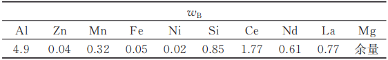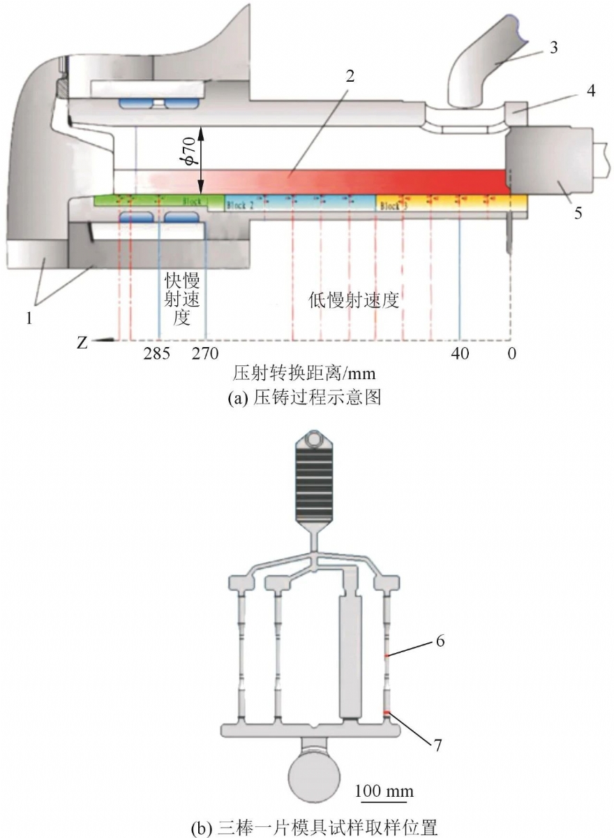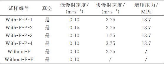 1.鑄型 2.金屬液 3.補(bǔ)縮管 4.沖頭套 表2 AE44鎂合金壓鑄過程中所采用的工藝參數(shù)