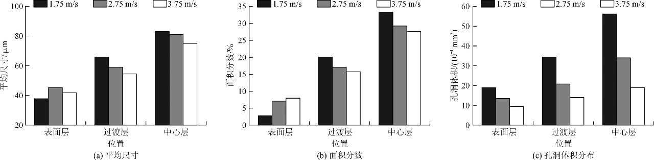 圖9 3種快慢射速度棒狀試樣的ESCs面積分?jǐn)?shù)、ESCs平均尺寸和孔洞體積分布 圖10為4種工藝(With-F-P-1,With-F-P-2,Without-P,Without-F-P)的試樣總縮松體積和縮松率。可見,加壓和低慢射速度比快慢射速度更能顯著降低孔洞率。從圖4和圖6可知,在加壓和較低慢射速度下制備的試樣中,氣孔和收縮孔的尺寸顯著減小。此外,澆口附近的縮松體積和縮松率明顯高于棒狀試樣中心位置。圖11為使用AnyCasting軟件獲得的金屬液充型過程和型腔內(nèi)凝固時(shí)間。熔融金屬通過澆口,首先填充棒狀試樣中心位置,近澆口的部分隨后充滿了強(qiáng)烈的熔體湍流,引起了夾帶空氣的積聚。最后,熔體凝固后在澆口附近形成巨大的圓孔。此外,從圖11d可以看出,靠近澆口的金屬凝固時(shí)間比棒狀試樣中心位置的長,其中,ESCs不斷生長,尺寸大于棒狀試樣中心位置。隨后,更多更大的ESCs將連接起來,形成較大的空隙,增加了殘余熔體的填充難度,產(chǎn)生了更多更大的孔洞。