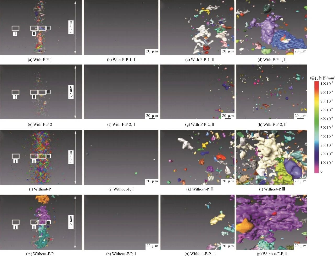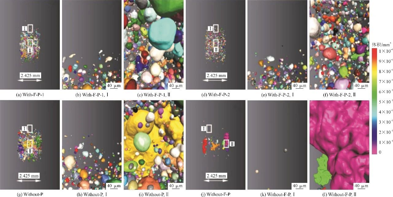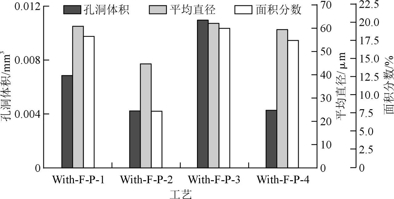 圖5 4種HPCD條件下棒狀試樣中心的三維重構(gòu)圖像 可以看出,在With-F-P-1中,孔洞缺陷主要聚集在試樣的心部,孔洞類型以氣孔和收縮孔為主。在With-F-P-2試樣中,隨著低慢射速度的增加,試樣中孔洞的數(shù)量和體積大大減少,孔洞形態(tài)主要為小氣孔。在Without-P試樣中,孔洞尺寸增大,孔洞分布分散。這一變化說明鑄造壓力可以使氣孔分布集中,縮小氣孔尺寸。當(dāng)采用Without-F-P工藝時(shí),顯示在棒狀試樣心部形成并積累了大的收縮孔,棒狀試樣心部孔洞堆積得越來越多、越來越大,容易形成縫隙,而剩余的熔體越少,填補(bǔ)縫隙的難度越大。隨后,在心部形成巨大的不規(guī)則凈收縮孔。