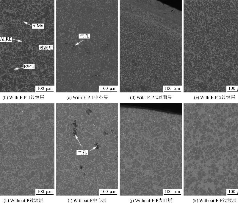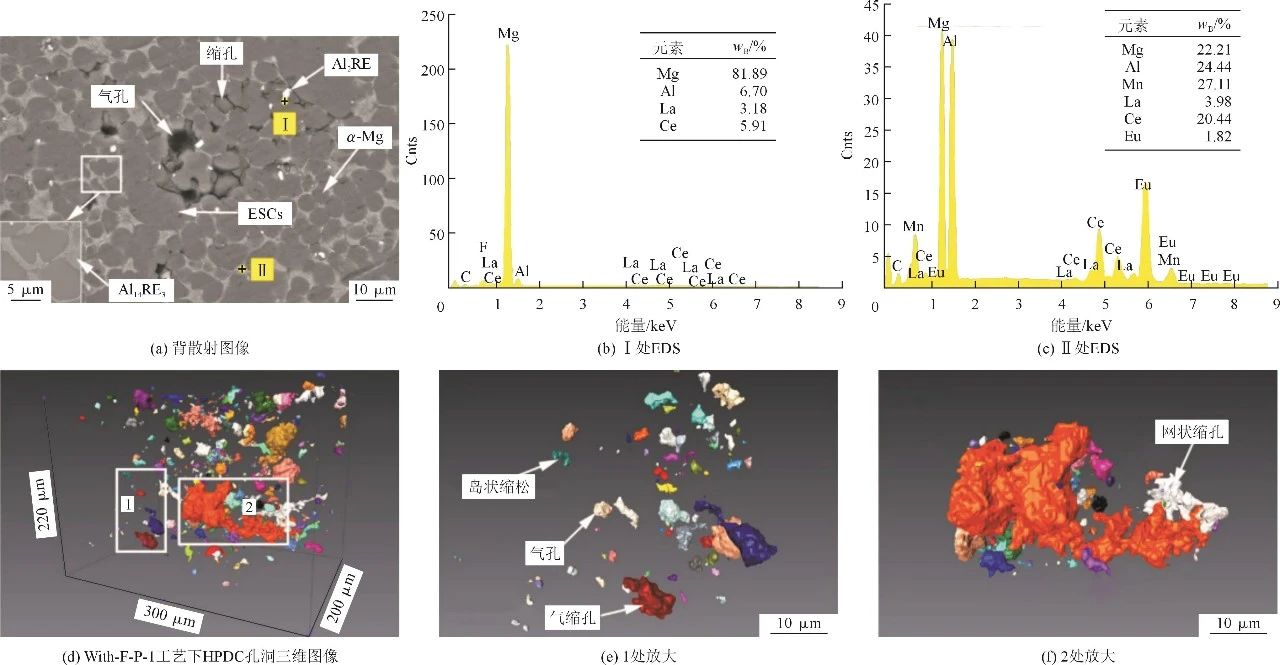 圖2 HPDC AE44鑄件的背散射掃描圖及析出物的EDS光譜,With-F-P-1工藝下HPDC鑄件孔洞的三維表征和標(biāo)記區(qū)域孔洞形態(tài) 從圖2a可見,微觀結(jié)構(gòu)包括小的圓形α-Mg晶粒,大的枝晶狀壓室預(yù)結(jié)晶(ESCs)和孔洞(氣孔和收縮) ,與相關(guān)研究結(jié)果相似。定量EDS分析表明,AE44鑄件中主要檢測到兩種稀土金屬間化合物相,一種是Al2RE相,呈明亮的白色顆粒狀,分散在α-Mg晶粒中;另一種是Al11RE3相,呈灰白色絮狀,主要分布在α-Mg晶界處,見圖2b和圖2c。與二維觀測相比,三維觀測將孔洞劃分為4種類型,分別為氣孔(圓形)、凈收縮孔(尺寸較大且較不規(guī)則,一般靠近聚集的ESCs)、氣收縮孔(圓形孔由不規(guī)則收縮孔連接)和島狀收縮孔(尺寸較小,在少量ESCs聚集的情況下不規(guī)則程度較低)。從試樣表面到心部,ESCs的大小和數(shù)量逐漸增加。隨著快慢射速度的增加,鑄件表層ESCs的尺寸和數(shù)量增加,而隨著快慢射速度的增加,鑄件中心ESCs的尺寸和數(shù)量逐漸減小,同時(shí),ESCs趨向于圓形。