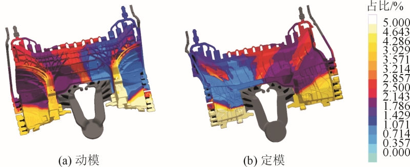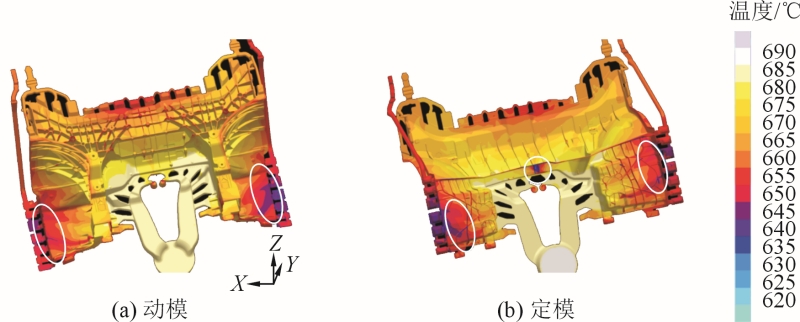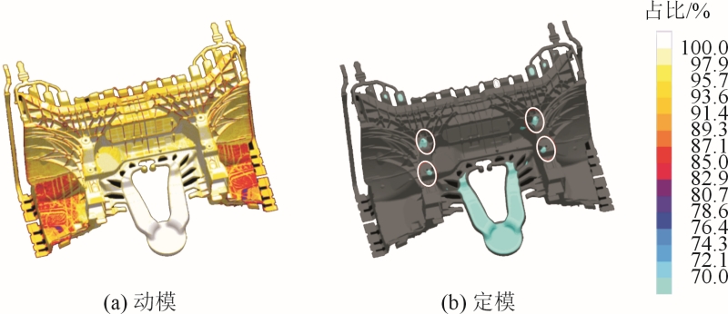 圖6 填充溫度分析 模流的材料追蹤分析見(jiàn)圖7。結(jié)果顯示,鑄件整體填充符合預(yù)期效果,減震塔和鉚接區(qū)域沒(méi)有多股鋁料匯聚交叉,澆注系統(tǒng)設(shè)定合理。通過(guò)觀察模流分析結(jié)果趨勢(shì)判斷,最后凝固位置為縮孔風(fēng)險(xiǎn)相對(duì)較高位置,模流的凝固分析(見(jiàn)圖8)。可以看出,鑄件最晚凝固區(qū)域均在產(chǎn)品厚壁區(qū)域。通過(guò)觀察模流分析結(jié)果氣體的流動(dòng)情況,對(duì)存在裹氣位置優(yōu)化排氣系統(tǒng)方案,加強(qiáng)排氣可改善裹氣,見(jiàn)圖9。結(jié)果顯示,當(dāng)填充到91%時(shí),圓圈位置出現(xiàn)裹氣,需要加強(qiáng)排氣設(shè)計(jì)。