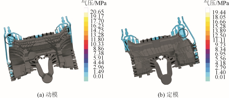 圖9 氣壓分析 模流的熱節(jié)分析見(jiàn)圖10。可以看出,鑄件壁厚較厚區(qū)域是主要熱節(jié)區(qū)域,分布在柱臺(tái)附近位置熱節(jié)較高。模流的縮孔分析見(jiàn)圖11。可以看出,使用Magma軟件進(jìn)行計(jì)算過(guò)濾15%后,顯示紅圈區(qū)域縮孔風(fēng)險(xiǎn)比較大(基于原圖為彩色表述,下同)。模流的粘模分析見(jiàn)圖12。可以看出,根據(jù)從材料年齡Fraction_Liquid分析,著色位置為產(chǎn)品最晚冷卻區(qū)域,紅圈處鋁液凝固時(shí)粘附在模具上時(shí)間最長(zhǎng),粘模燒傷風(fēng)險(xiǎn)較高。
