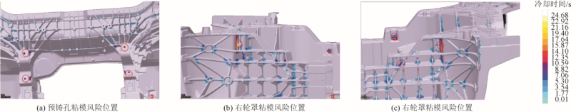 圖12 粘模風(fēng)險(xiǎn)位置分析 根據(jù)仿真分析結(jié)果輸出優(yōu)化對(duì)策:①冷隔風(fēng)險(xiǎn)區(qū)域增加澆道對(duì)沖該位置,提高該區(qū)域的填充溫度;②對(duì)縮孔風(fēng)險(xiǎn)位置模具留出預(yù)鑄針孔并增加高壓冷卻,降低縮孔風(fēng)險(xiǎn);③針對(duì)局部裹氣位置,優(yōu)化排氣系統(tǒng),加強(qiáng)排氣效果;④熱節(jié)風(fēng)險(xiǎn)位置模具留出預(yù)鑄針孔并增加高壓冷卻;⑤粘模高風(fēng)險(xiǎn)位置對(duì)模具型芯針進(jìn)行氮化處理和模具表面披覆處理。修改后的模具設(shè)計(jì)方案見(jiàn)圖13。根據(jù)仿真分析結(jié)果和模具方案,壓鑄機(jī)最大鎖模力為70 000 kN,壓射力為1 078 kN,系統(tǒng)壓力為17.5 MPa,匹配設(shè)備P-Q曲線(見(jiàn)圖14),確定設(shè)備選型方案。
