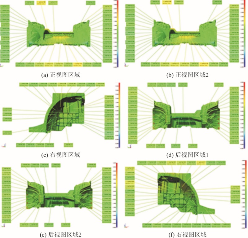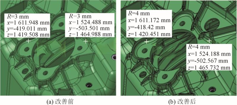 圖18 藍(lán)光掃描結(jié)果 從產(chǎn)品的結(jié)構(gòu)看,產(chǎn)品壁厚和筋條壁厚不均勻且差異較大,壁厚局部過(guò)厚變化劇烈,根部R角過(guò)小,使局部填充率低,導(dǎo)致溫度降低后再填充造成冷隔(見(jiàn)圖19和圖20)。修改筋條結(jié)構(gòu),定模模芯減厚優(yōu)化壁厚,加大根部R角(見(jiàn)圖21)。采取上述措施后,金屬液填充情況明顯改善,基本解決了冷隔和R角裂紋問(wèn)題。