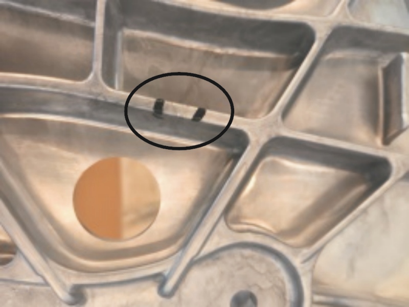圖21 改善結(jié)構(gòu) 圖22為進(jìn)澆口位置拉傷。該位置起模斜度小,進(jìn)料量較大,模具局部溫度高,澆口位置填充速度較快。該位置需要螺柱焊接,產(chǎn)品的表面粗糙度不能過(guò)大,所以不能通過(guò)模具表面粗糙處理改善,需要模具開(kāi)鑲件加大該面的起模斜度,調(diào)整噴涂,將模具溫度從80℃降到50℃,同時(shí)降低高速速度。按照上述措施,有效改善了拉傷問(wèn)題。 模具滑塊打開(kāi)時(shí)渣包排氣道斷裂,鑄件拉變形(見(jiàn)圖23)。通過(guò)加大渣包起模斜度(見(jiàn)圖24),改善渣包排氣道的脫模效果;沖澆口模具增加矯形功能,改善了排氣道的脫模效果,解決了拉變形問(wèn)題,同時(shí)導(dǎo)入了沖模壓矯功能,提升了產(chǎn)品矯形的效率并保證了產(chǎn)品兩側(cè)輪罩變形量和開(kāi)襠距離。