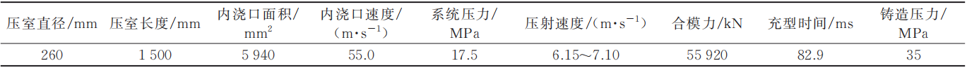 壓鑄難點(diǎn)和風(fēng)險(xiǎn)點(diǎn):一體化壓鑄前艙作為車體前部的結(jié)構(gòu)件需要兼顧碰撞、疲勞、連接性能的要求,要求其在鑄態(tài)下能達(dá)到較高的強(qiáng)度和韌性;同時(shí)需要滿足多種連接方式的要求,不同部位有不同的連接方式,如焊接、SPR、膠接等;一體化壓鑄零件整體尺寸大、填充流程長(zhǎng)、凝固差異大,需要壓鑄時(shí)能保證較好的充型以及熱平衡能力;一體化前艙壓鑄零件采用免熱處理合金,可以避免熱處理變形,但需要對(duì)材料成分進(jìn)行過(guò)程管控,包括來(lái)料檢查、爐內(nèi)檢查和產(chǎn)品本體檢查等。 一體化前艙零件材料選用AlSi7系免熱處理材料,包含澆道和排氣道質(zhì)量約為65.5 kg,投影面積為15 978 cm2,平均壁厚為4.6 mm;通過(guò)產(chǎn)品的模具充滿度45%、壓室投影面積、鋁液密度、產(chǎn)品質(zhì)量和壁厚等計(jì)算出壓射工藝參數(shù)(見(jiàn)表3和表4)和壓射速度曲線(見(jiàn)圖3)。 表3 壓射工藝參數(shù)表