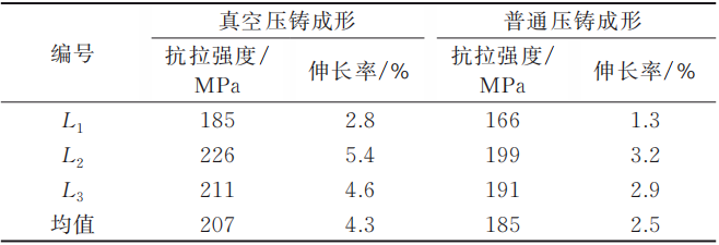 圖6 真空壓鑄散熱器底板顯微組織圖 結(jié)論 (1)采用新型真空抽氣系統(tǒng)進(jìn)行真空壓鑄試驗(yàn),結(jié)果表明鎂合金散熱器真空壓鑄件外形完整、冷隔較少,開(kāi)裂件數(shù)明細(xì)降低,與相同工藝參數(shù)的普通壓鑄件相比,其平均抗拉強(qiáng)度提高了12%,伸長(zhǎng)率提高了72%。 (2)當(dāng)快壓射速度較高時(shí),真空壓鑄件容易出現(xiàn)縮松、縮孔等鑄造缺陷;當(dāng)快壓射速度較低時(shí),則容易出現(xiàn)冷隔、表面流痕等鑄造缺陷,從而影響產(chǎn)品的最終質(zhì)量。 (3)在快壓射速度為4m/s、慢壓射速度為0.2m/s、慢壓射距離為120mm、壓射比壓為84MPa的條件下,能夠獲得外形完整、組織致密、力學(xué)性能良好的鎂合金真空壓鑄件。