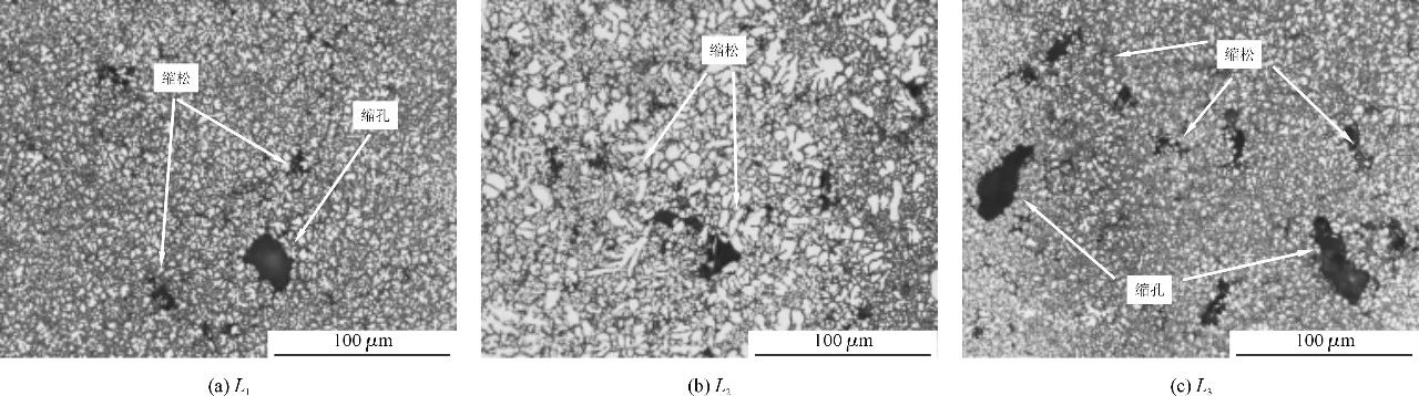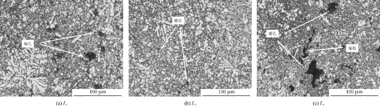 圖4 L1散熱片表面缺陷 采用L1~L3工藝參數(shù)分別制取普通壓鑄件與真空壓鑄件若干。分別對(duì)3組試驗(yàn)制取的普通壓鑄件和真空壓鑄件進(jìn)行取樣,取樣位置分為散熱片第2片和底板兩部分,見(jiàn)圖2。采用電火花線切割機(jī)制取金相晶相試樣和拉伸試樣,用JHY-5000電子萬(wàn)能實(shí)驗(yàn)機(jī)對(duì)散熱片進(jìn)行力學(xué)性能測(cè)試。可以看出,L1散熱片上存在尺寸較大的縮孔和分布范圍較廣的縮松;L2散熱片上的縮松范圍較小,尺寸較小;L3散熱片存在尺寸較大的縮孔和縮松。L1底板存在尺寸較小的縮孔但分布范圍廣;L2底板存在少量縮松和尺寸較小的縮孔;L3底板存在多處縮松和縮孔。分析認(rèn)為,采用自主設(shè)計(jì)的真空抽氣系統(tǒng)能夠把模具型腔的大部分氣體抽出,因而制得的真空壓鑄件內(nèi)部氣孔有所減少,但由于快壓射速度不同導(dǎo)致抽真空時(shí)間不同,模具型腔的最終氣壓也不同,型腔里金屬的流動(dòng)狀態(tài)也有差異,所以3組試驗(yàn)制得的真空壓鑄件其縮松、縮孔也有差別。 表3 散熱片力學(xué)性能
