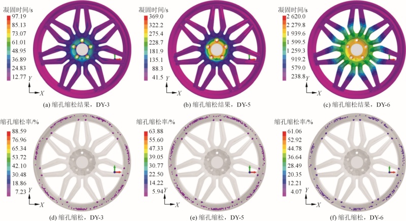 圖5 不同澆注壓力下低壓鑄造輪轂的縮孔縮松情況 選取DY-3、DY-7、DY-8等3組試驗(yàn)方案進(jìn)行模具溫度對(duì)低壓鑄造過(guò)程影響的研究。圖6為不同模具溫度時(shí)輪轂的充型模擬結(jié)果。可以看出,不同模具溫度條件下模具的充型保持平穩(wěn)流動(dòng),沒(méi)有發(fā)生紊流飛濺現(xiàn)象,整個(gè)充型順序保持一致。模具溫度提高,模具充滿時(shí)間變化很小,模具溫度對(duì)充型速率的影響很小。 不同模具溫度對(duì)輪轂鑄造過(guò)程的影響主要集中在對(duì)輪轂?zāi)趟钑r(shí)間,表4為模具溫度下輪轂?zāi)碳翱s孔縮松參數(shù),模具溫度由30 ℃提高到300 ℃時(shí),輪轂?zāi)趟钑r(shí)間增加了300%以上,故而輪轂有足夠的時(shí)間進(jìn)行補(bǔ)縮,縮孔縮松出現(xiàn)概率由88.59%變?yōu)?3.88%,降低了27.89%。但是繼續(xù)提高模具溫度至400 ℃,雖然凝固所需時(shí)間繼續(xù)增加,但是在薄壁位置率先凝固導(dǎo)致液體補(bǔ)縮量存在上限。故而在保證低壓鑄造順利進(jìn)行情況下,可以在保證成本的情況下適當(dāng)提高模具溫度來(lái)降低輪轂的縮孔縮松出現(xiàn)概率。 圖7為不同模具溫度下低壓鑄造輪轂的縮孔縮松情況。縮孔縮松出現(xiàn)位置同樣分布基本一致且主要集中在輪輞位置。但是,模具溫度升高到300 ℃時(shí)輪轂在輪輻位置縮孔縮松出現(xiàn)概率降低。這是因?yàn)樘岣吣>邷囟龋嗇炘诔湫徒Y(jié)束時(shí)輪輻位置溫度較高,金屬液可以更好地進(jìn)行補(bǔ)縮。實(shí)際生產(chǎn)過(guò)程中可以適當(dāng)提高模具溫度以降低輪輻位置處的鑄造缺陷。
