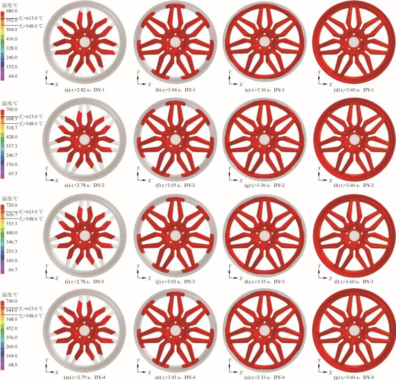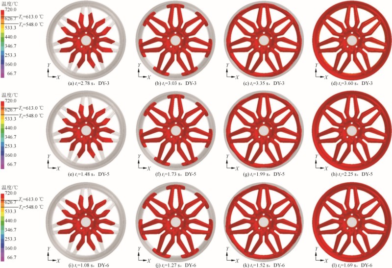 圖2 不同澆注溫度下低壓鑄造輪轂的充型過(guò)程