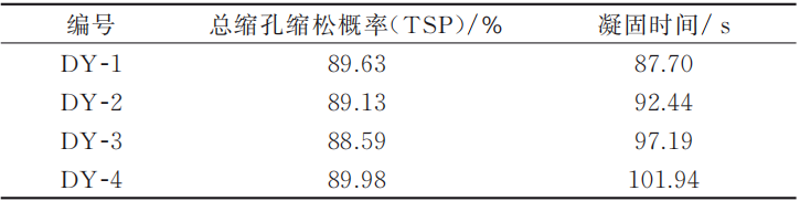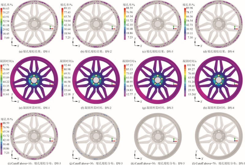表1 3因素4水平正交試驗(yàn)設(shè)計(jì) 選取DY-1、2、3、4試驗(yàn)方案進(jìn)行澆注溫度對(duì)低壓鑄造過(guò)程影響的研究。圖2為不同澆注溫度時(shí)低壓鑄造輪轂的充型模擬結(jié)果,可以看出,不同澆注溫度下模具的充型保持平穩(wěn)流動(dòng),沒(méi)有發(fā)生紊流飛濺現(xiàn)象,整個(gè)充型順序保持一致。 選取4種試驗(yàn)方案下輪轂的總縮孔縮松概率[Total shrinkage porosity (TSP)]、凝固時(shí)間(Time to solidus)對(duì)輪轂的鑄造缺陷進(jìn)行對(duì)比分析,見(jiàn)表2??梢钥闯?,隨著鑄造溫度增加,輪轂?zāi)趟钑r(shí)間不斷延長(zhǎng)。同時(shí)比較4種澆注溫度工藝制度下的縮孔縮松分布情況,DY-3縮孔縮松結(jié)果最優(yōu),這是因?yàn)镈Y-3充型結(jié)束時(shí)的溫度較高,凝固過(guò)程中可以更好地進(jìn)行補(bǔ)縮,故而縮孔縮松最少。 圖3為不同澆注溫度下低壓鑄造輪轂的縮孔縮松結(jié)果。從圖3a~圖3d中可得,不同澆注溫度的縮孔縮松出現(xiàn)位置分布基本一致,主要集中在輪輞位置。輪輞位置由于輪轂壁厚較薄,在金屬型的強(qiáng)烈激冷作用下,該部分率先凝固,使得凝固后期即使在壓力作用下也無(wú)法從澆口處得到足夠的金屬液,因此容易出現(xiàn)縮孔縮松缺陷。比較圖3i~圖3l可知,隨著TSP的不斷增加,輪轂的縮孔縮松位置不斷減少,表明輪轂?zāi)踢^(guò)程中缺陷最有可能出現(xiàn)的位置集中在輪輞與輪輻連接處。