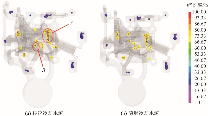 圖12 深腔最終凝固時間分布圖 圖13為傳統冷卻水道和隨形冷卻水道下鑄件縮松縮孔預測圖。可以看出,隨形冷卻水道下鑄件內部質量更好,在調整缺陷概率發生20%的情況下,溢流槽和底部矩形通孔端面都有縮孔缺陷發生,但在鑄件深腔內的最后充型位置A、B處的局部縮松率存在著較大差異。傳統冷卻水道下的鑄件A處出現了縮松,體積為0.1746cm3,而隨形冷卻水道下的縮松體積下降到0.1356cm3;傳統冷卻下B處產生的0.0194cm3縮松體積在使用了隨形冷卻鑲塊后直接消除。 傳統冷卻水道下的鑄件縮松縮孔體積約為0.8436cm3,縮松縮孔發生平均概率約為25.57%。帶有隨形冷卻水道鑲塊的鑄件縮松縮孔體積約為0.7605cm3,減少了9.8%,縮松縮孔平均發生概率降低到24.92%。這是由于采用了隨形冷卻的鑄件能夠有效降低深腔頂部壁厚區域的溫度,使得鑄件與模具間溫差小,保證了金屬液流動暢通,針對孤立液相區的補縮能力提高,進而降低了縮松縮孔發生的可能性。