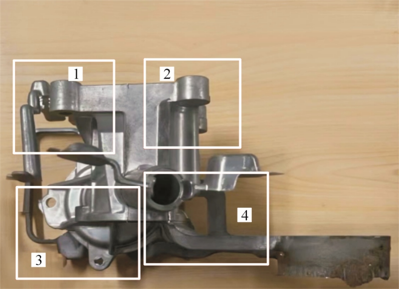 圖13 鑄件縮松縮孔預測圖 將模擬驗證最優冷卻方案的隨形冷卻鑲塊安裝到模具上,采用海天HDC400壓鑄機進行實際生產,后處理去除溢流槽后的鑄件見圖14。從外觀能夠初步判斷該鑄件具有較好的表面粗糙度,無明顯翹曲變形。對圖14水泵壓鑄件分成4個區域進行X射線探傷,觀察鑄件內部是否產生縮松縮孔缺陷,結果見圖15,可以看出鑄件內部無缺陷。在水泵座深腔頂部取樣,見圖3a圓圈所示。線切割機切割并用XQ-1鑲嵌試樣,用300~1000目砂紙打磨后用拋光布和W1及W2.5金剛石研磨劑在金相試樣磨拋機上拋光,用體積分數為0.5%的HF腐蝕,靜置3~5s后用無水乙醇清洗干凈并用吹風機吹干。使用蔡司AxioVertA1光學顯微鏡觀察顯微組織。使用蔡司EVO18型掃描電鏡進行SEM觀察。組織分析見圖16。
