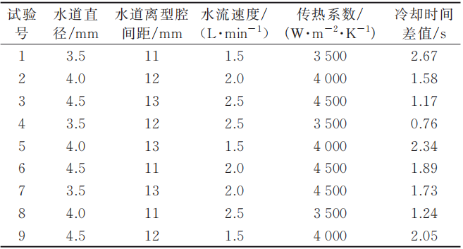 圖5 水道離型腔間距與模具熱變形量關系圖 為了統一冷卻水道相關工藝參數,采用正交試驗得到影響鑄件冷卻均勻性的參數(水道直徑、水道離型腔間距、水流速度和傳熱系數)范圍優化值。模擬采用傳統水道方案里的模型,因變量取最終凝固時深腔頂部兩點總冷卻時間差值,選擇望小特性,4因素3水平試驗表見表2。得到的冷卻水道范圍優化工藝參數:水道直徑為3.5mm、水道離型腔間距為12mm、水流速度為2.5 L/min、傳熱系數為3500W/(m2·K)。 提取鑄件深腔凹模的邊緣線一定距離(h=8mm),充分考慮模具深腔頂部圓角處的應力分布及傳熱效應,以凹模頂部圓角位置作為基點,用離型腔距離確定其布置水道的中心點;然后同確定好的水道直徑4.5mm畫圓,在類球殼界面上做螺旋式引導,并與沿著頂部正中心及重力方向的輪廓線相連接,使其覆蓋深腔頂部型腔,見圖6。采用圓形的水道截面和緊貼內腔形狀的多層螺旋型結構,可以達到接觸面均勻冷卻的效果。 表2 L9(34)正交試驗表