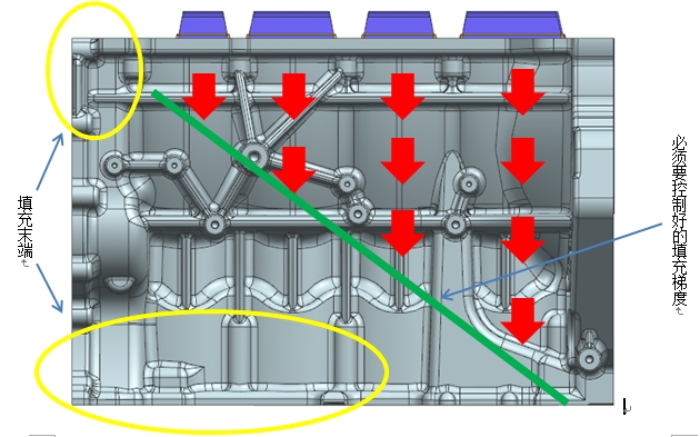 1.單側進澆優缺點: 1)優點:單側進澆由于鋁水從一側往另一側順序填充,在天側滑塊設置大的排氣和真空,對于整個填充過程的排氣排渣效果相對較為有利; 2)優點:單側進澆往往會選擇特征較為復雜的主油道測進行入料,所以通常主油道等關鍵區域附近質量相對較好,此點也符合關鍵區域優先進料的澆排設計原則; 3)缺點:如上述由于缸孔對于流態的阻隔,單側進料鋁水的填充通道只有曲軸部位,這相當于將天側面分割成了幾塊,然后鋁液在天側面進行交匯;如果以缸孔為中心,這勢必造成天側面的成型質量要整體差于進料測,所以此種進料方式整個產品的致密性是按照進料方向遞減的;遠端存在縮孔而發生泄露的問題往往無法解決,只能通過浸滲來降低泄露率; 4)缺點:正因為存在上述問題,單側進料往往需要更大的速度和壓力來彌補填充通道的不足,這也間接降低了模具壽命,至少是進料側的壽命;